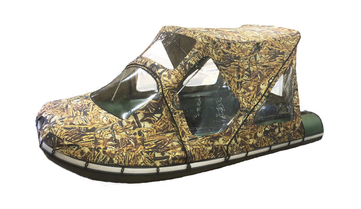 Тент-палатку, при необходимости, можно полностью сложить вместе с каркасом и уложить на нос лодки прямо на воде, оставив только носовой тент.