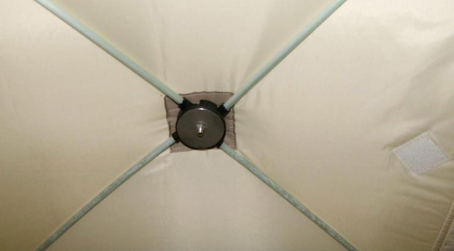 Каркас палатки изготовлен из металлических хабов и стеклокомпозитных прутков собственного производства, обладающих повышенной прочностью и отличной жесткостью. Тент состоит из трех слоев: внутренний слой из прочной светлой ткани Oxford 240 D 1000 PU склеен со слоем утеплителя из синтепона по всей площади, который в свою очередь также склеен с внешним слоем из ткани Oxford 240 D 1000 PU. Такая конструкция тента (без термостежки) исключает мостики холода и делает тент палаток исключительно теплым.