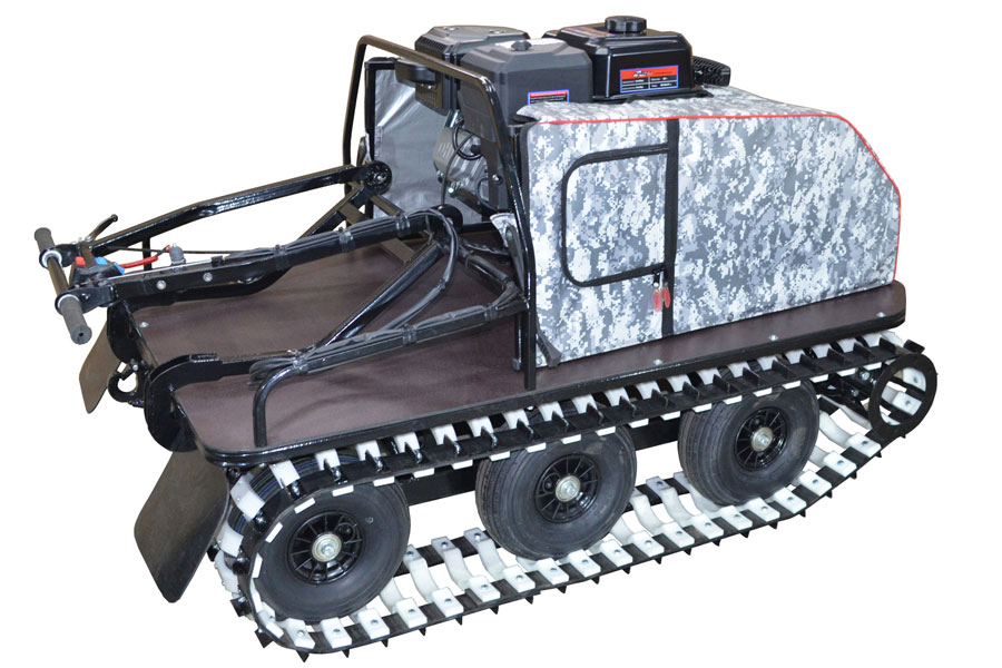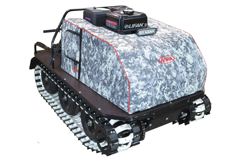 Буксировщик KOiRA T 15 ЕR тканнопластик благодаря оснащению в виде двух раздельных широких гусениц отличается высокой всесезонной проходимостью по любому бездорожью: снег с водой, болота, размытые дороги, глина, бревна - все что угодно. Мотобуксировщик KOiRA оснащен реверс-редуктором, ручным и электрическим стартером, дисковым тормозом, светодиодной фарой 18 Вт и блоком кнопок с чекой аварийной остановки: кнопкой управление светом, кнопкой стар/стоп мотор и кнопкой запуска двигателя. Предусмотрены крепления и посадочные места для аккумулятора. Поставляется в комплекте с 15-ти сильным двигателем Loncin G420FD (190FD) D25 объемом 420 см3. Объем масла в двигателе - 1.1 л., объем топливного бака - 6 литров.